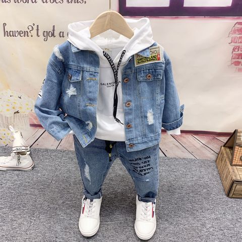 Güneşli bebek 1-5T erkek ilkbahar ve sonbahar yüksek kaliteli erkek Denim ceket + kapşonlu Sweatshirt + pantolon 3 parça giysi set
